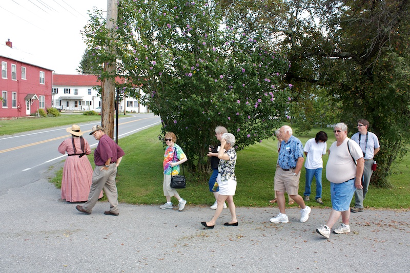 Our tour group led by guide Phyllis walking from Rowan House to the Jonathan Arnold House (red building on far left).