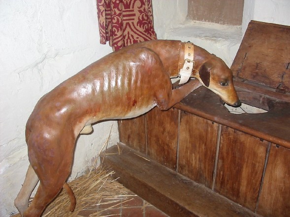 A wax figure of a hunting dog in a lu of the Middle Ages.