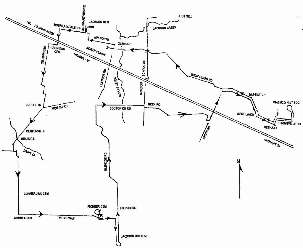 Not on the tour, but close by is Jackson Falls on Jackson Creek (see tour map). Jackson Creek is a tributary of McKay Creek and is about eight miles north of Hillsboro. The falls of this stream are known as Jackson Falls. These features were named for John B. Jackson, a pioneer settler who took up a donation land claim nearby.